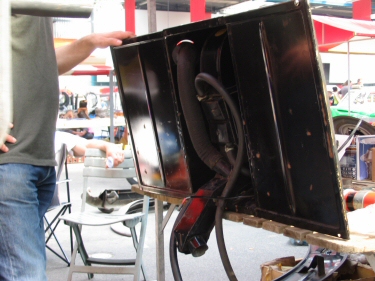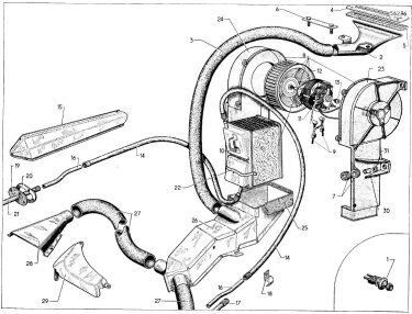 | Figure 6. The distribution nozzle under the rear seat cushion (part no. 28 in the parts drawing). | Figure 7. The heater radiator + fan unit |