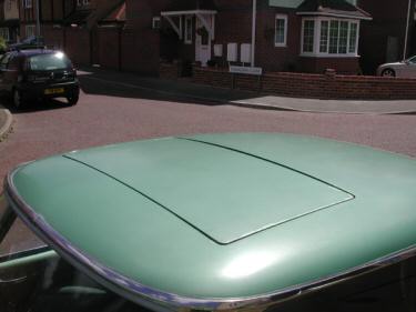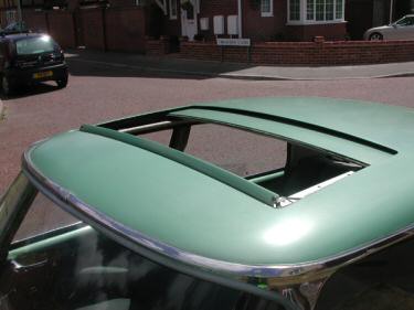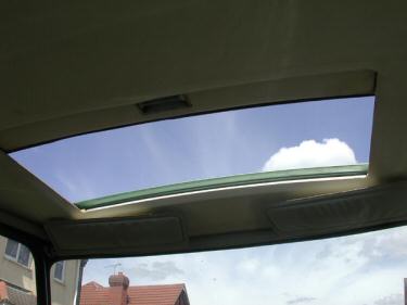 steel. In the photos you can see an aerofoil that springs up at the front of the aperture when the roof is opened. This is made of plastic, which has been sprayed to the body colour of the car. The tracks seem to be made of aluminium and the recess that the whole mechanism sits in seems to be steel. The sunroof is lined with the same material as the head-lining of the car. To open the roof one simply pulls on the plastic handle inside, which unlatches a locking mechanism. Closing is the reverse action. Drainage of the roof slides is by tubes which run down the back roof supports and issue under the rear wings. |