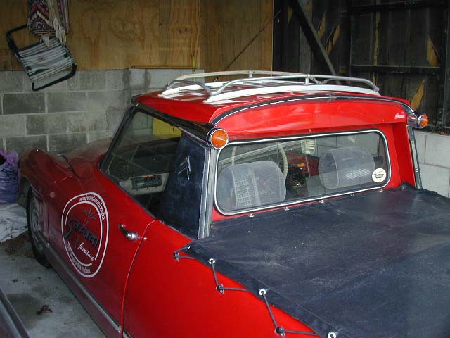 Citroën dealer. He used the rear panels of an English Safari, as you can tell by the Lucas tail lights. The roof is a shortened steel one, also of a Safari wagon, as is the (shortened) roofrack. The whole backsection is reinforced by steel plates and angle iron to stiffen the chassis for carrying heavier loads. All the '66 running gear was replaced by that of a 1974 DSuper, inclusive the suspension system (LHM). |