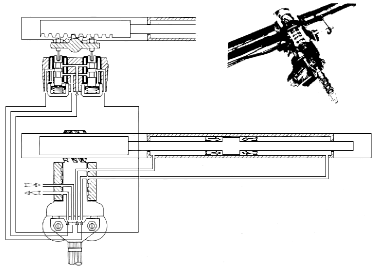 When the wheel is turned, this leads to a movement of the slide-valves in relation to their sleeves in the valve block. One slide-valve moves down, the other rises. The valve which moves down connects high-pressure to one side of the piston. The second slide-valve which rises, allows the fluid on the other side of the piston to return to the reservoir. |