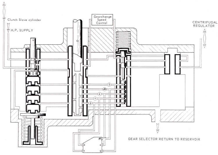 | 1) | Purpose : The hydraulic fluid which operates the gear-change circuits is not always at the same temperature or pressure when it reaches the hydraulic gear selector. If not corrected, these variations would cause errors in the times for gear operation. To overcome this, the fluid operating the gears passes through a gear change speed regulator mounted on top of the hydraulic gear selector. |